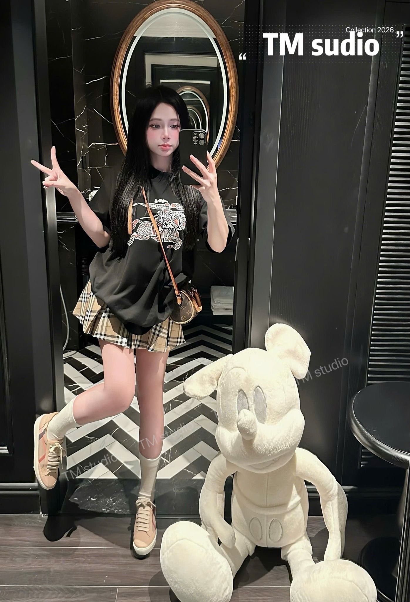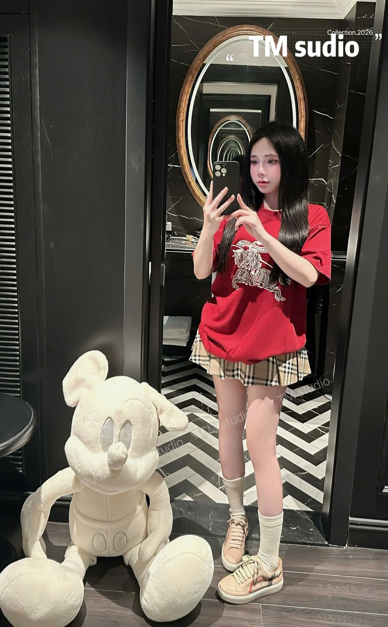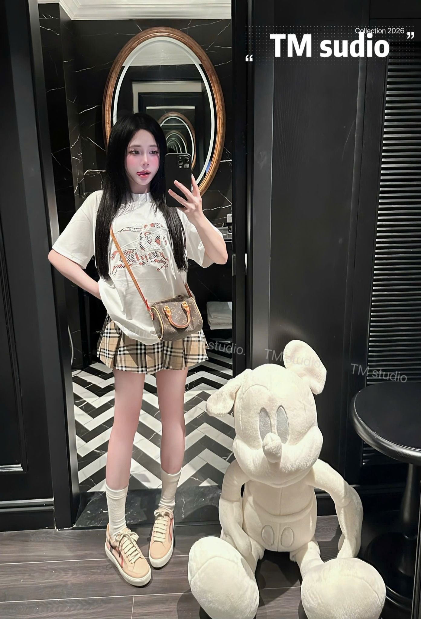 Set áo thun in ngựa mix chân váy xếp ly kẻ BBR - ĐEN - B187 (S<68CM, M<72CM)